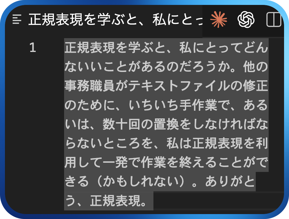 他の事務職員がテキストファイルの修正のために、いちいち手作業で、あるいは、数十回の置換をしなければならないところを、私は正規表現を利用して一発で作業を終えることができる(かもしれない)。